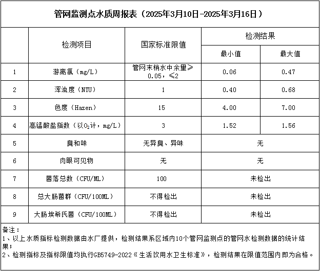 管網(wǎng)監(jiān)測(cè)點(diǎn)水質(zhì)周報(bào)表(2025年3月10日-2025年3月16日)