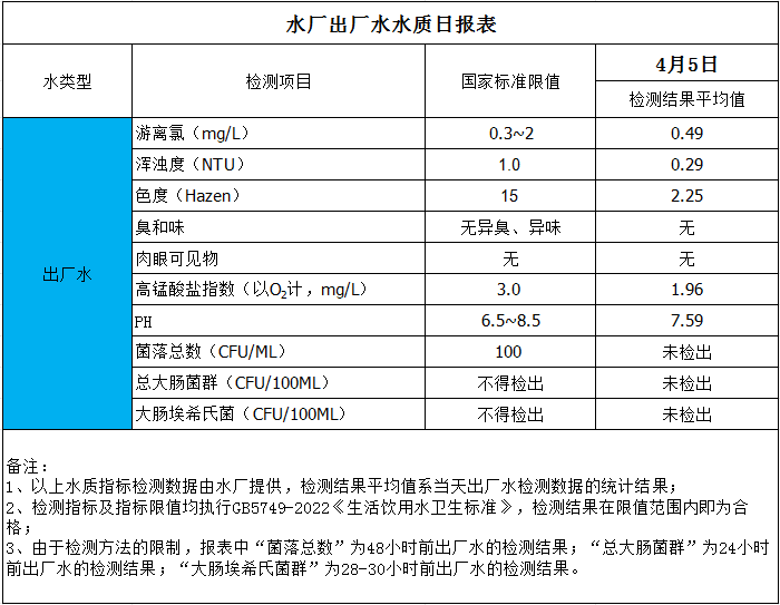 水廠出廠水水質(zhì)日?qǐng)?bào)表(2025-4-5)