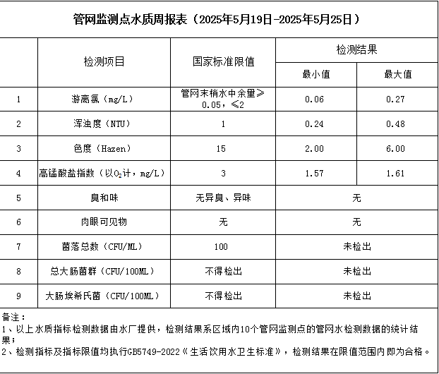 管網(wǎng)監(jiān)測點水質(zhì)周報表(2025年5月19日-2025年5月25日)