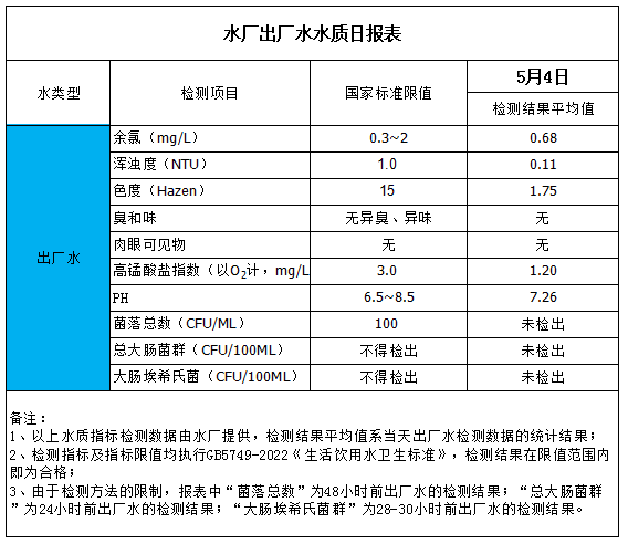 水廠出廠水水質(zhì)日報表(2023-5-4)