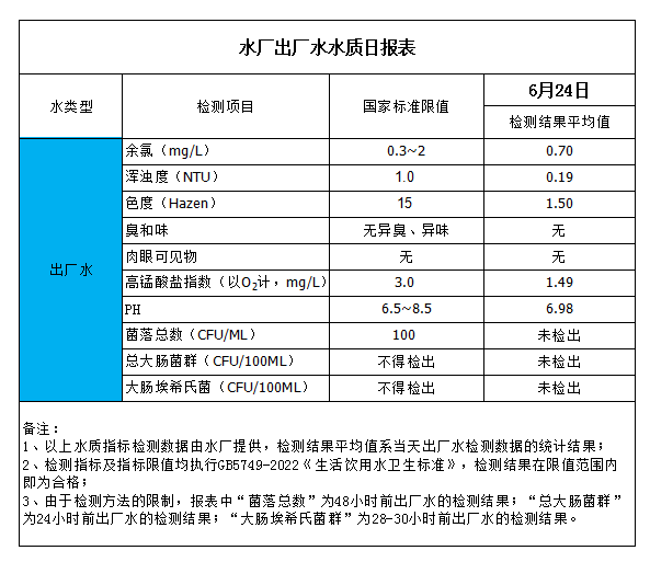 水廠出廠水水質(zhì)日?qǐng)?bào)表(2023-6-24)