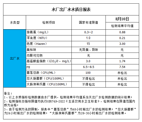 水廠出廠水水質(zhì)日報表(2023-8-10)