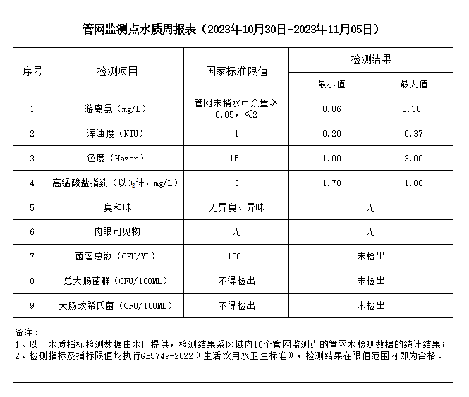 管網(wǎng)監(jiān)測(cè)點(diǎn)水質(zhì)周報(bào)表(2023年10月30日-2023年11月05日)