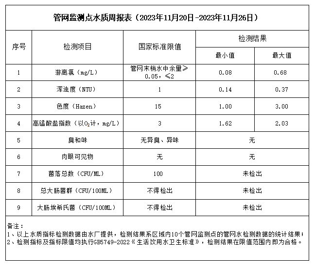 管網(wǎng)監(jiān)測點(diǎn)水質(zhì)周報(bào)表(2023年11月20日-2023年11月26日)