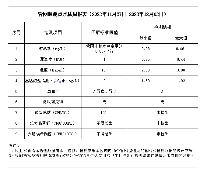 管網(wǎng)監(jiān)測(cè)點(diǎn)水質(zhì)周報(bào)表(2023年11月27日-2023年12月03日)
