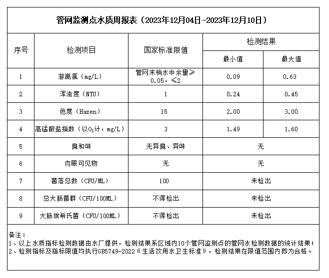 管網監(jiān)測點水質周報表(2023年12月04日-2023年12月10日)