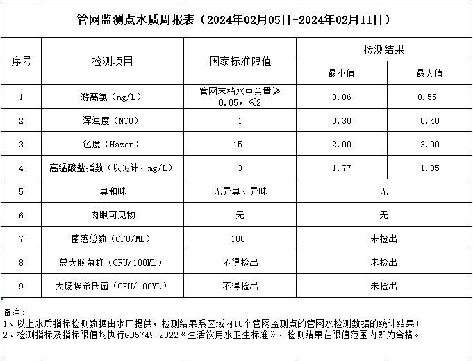 管網(wǎng)監(jiān)測點(diǎn)水質(zhì)周報表(2024年02月05日-2024年02月11日)