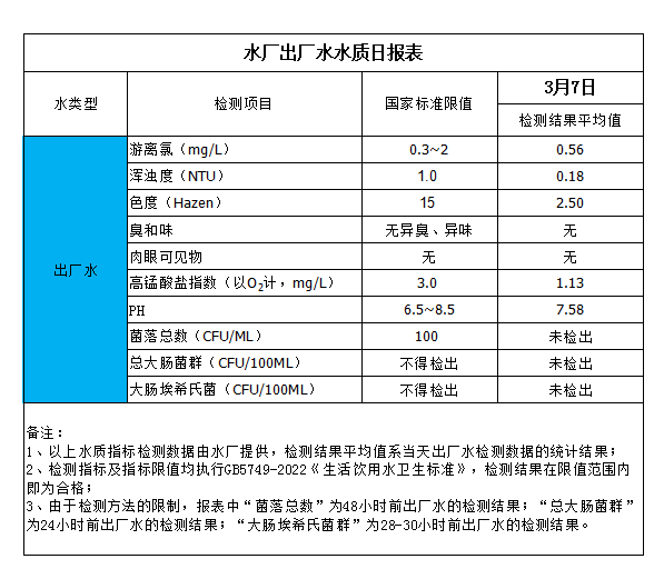 水廠出廠水水質(zhì)日?qǐng)?bào)表(2024-3-7)