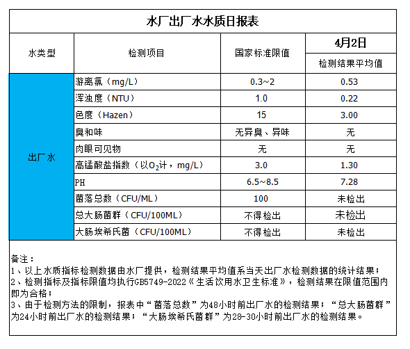 水廠出廠水水質(zhì)日報表(2024-4-2)