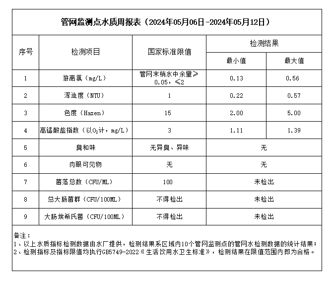 管網(wǎng)監(jiān)測點(diǎn)水質(zhì)周報表(2024年05月06日-2024年05月12日)