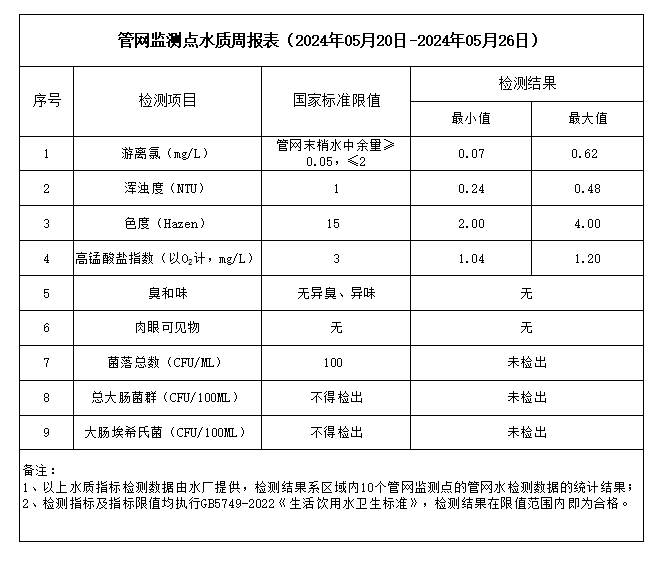 管網(wǎng)監(jiān)測點(diǎn)水質(zhì)周報(bào)表(2024年05月20日-2024年05月26日)