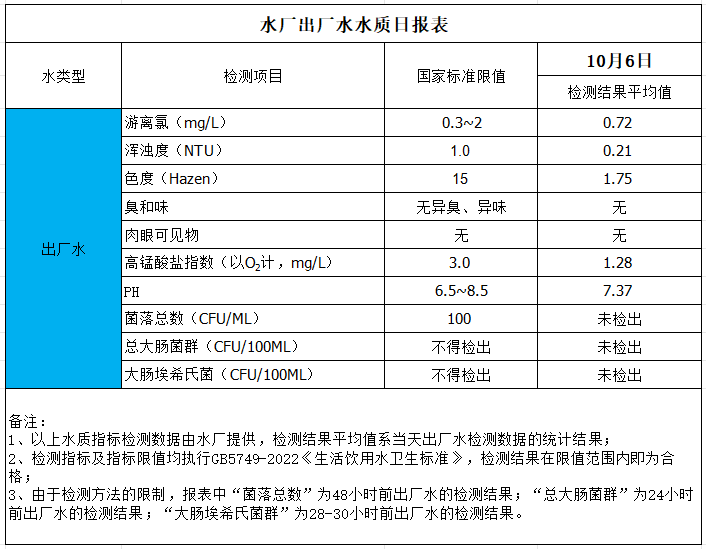 水廠出廠水水質日報表(2024-10-6)